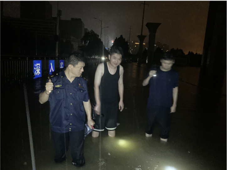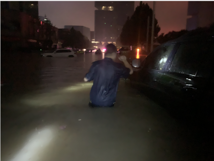 7月20日下午,郑州市突降特大暴雨,灾情严重。郑东大队迅速反应,积极行动,当晚由值班人员岳军带头,冒雨前往辖区灾情一线进行巡查。在巡查的途中,执法人员对路边上的所有积水车进行逐个排查,确保车内无被困群众。执法人员利用对周边路况比较熟悉的优势,带领被困群众转移到安全地带,带领群众脱险,并用车载扬声器对即将涉水的群众进行劝返劝离。
