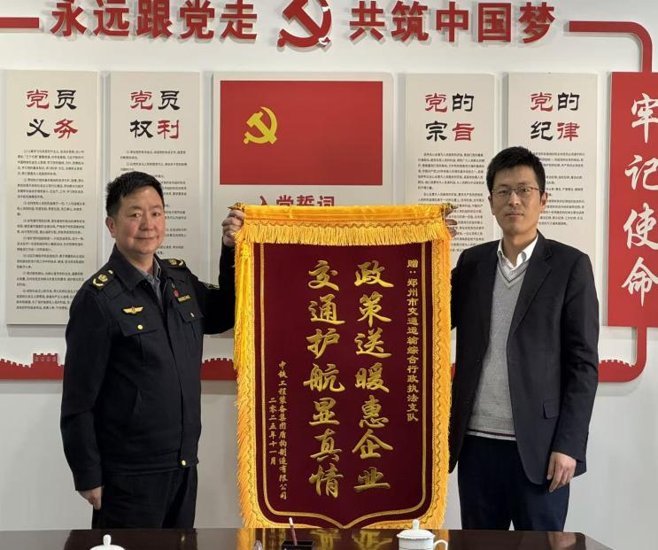 11月25日,中国中铁装备集团有限公司副总经理张维华一行四人专程来到市交通运输执法支队进行回访,并赠送了一面写有“政策送暖惠企业,交通护航显真情”字样的锦旗,对执法支队主动作为、精准服务企业表示诚挚感谢。支队党委班子成员及相关负责人热情接待并进行了座谈交流。