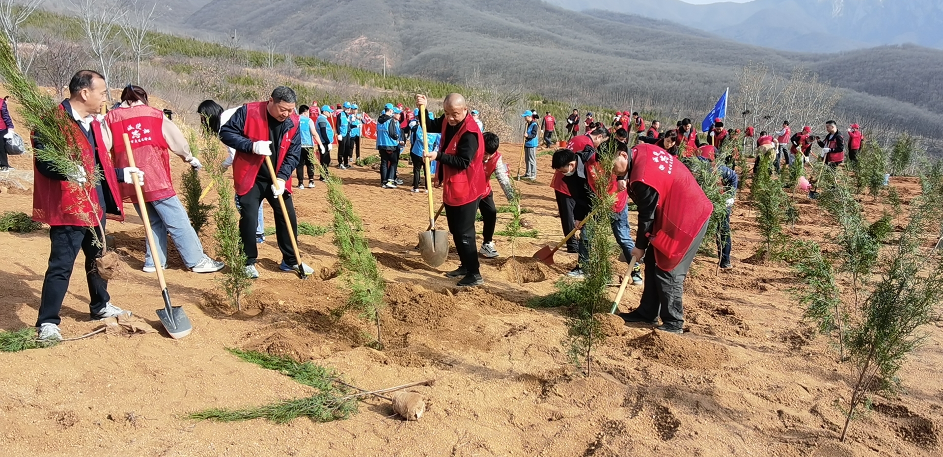 在植树活动现场,大家满怀热情、团结协作,按照工作人员的技术指导和栽植要求,搬运树苗、铲土挖坑、扶苗回填、提水浇灌、封土保墒……认真做好每一道工序。经过一番辛勤劳动,数百棵松柏树苗一行行、一排排伫立在山坡,沐浴在春日的阳光下,绿意浓浓。