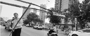 8月30日清晨,郑州公交一公司一车队216路车长常强行至桐柏路开元小区时,大老远就看见前方垂落一摞电线,造成过往车辆纷纷绕行。