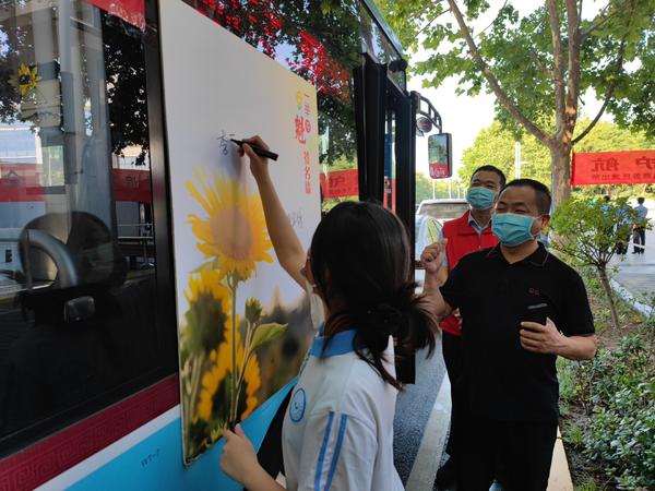 为了能让考生缓解紧张的情绪,考出理想的成绩,车长们不仅将亲手制作的“向日葵”布满了车厢,寓意一举夺“葵”,还在车外设置了签名墙,供考生和家长们写下自己的心愿。“加油!”“祝考生们一举夺魁!”“祝愿金榜题名!”一个个美好的祝愿、一句句加油鼓劲的话语,不一会儿,这张签名墙就写满了祝福。