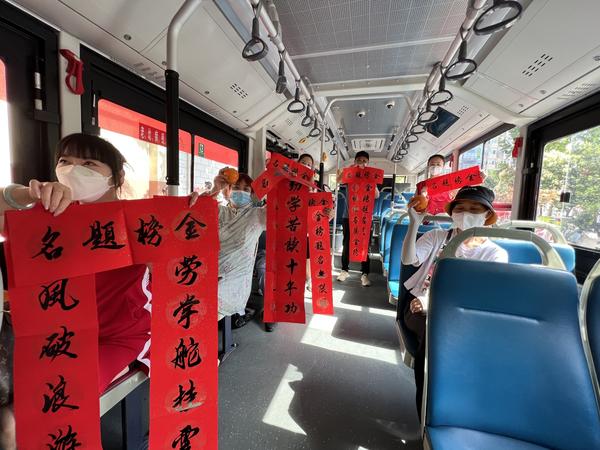 走上这辆爱心纳凉公交车,大家惊喜地发现志愿者们特意为考生及送考家长们准备了面包和橙子,寓意着考生们能“包”证“橙”功。同时,在车前还有一位身穿红马甲的公交志愿者正在挥毫泼墨,“金榜题名笑颜开,多年梦想得实现……”不一会工夫,志愿者就将“新鲜出炉”的对联送到了送考家长的手中,一副副小小的对联让家长的脸上露出了灿烂的笑容,也抹平了他们紧张焦虑的心情。