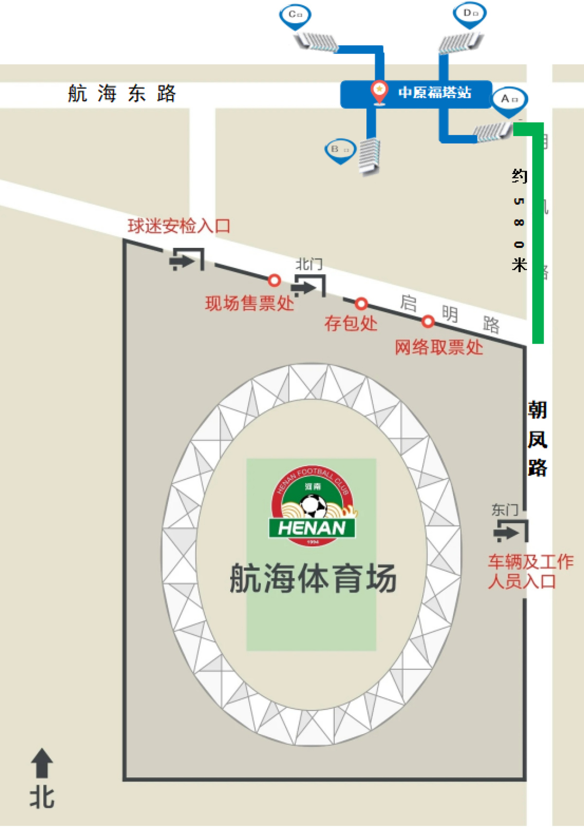 2023赛季首场比赛时间为2023年4月16日19:35。如坐地铁前往比赛地点航海体育场,可以选择乘坐至郑州地铁5号线中原福塔站,从A口出发向南580米即可到达。