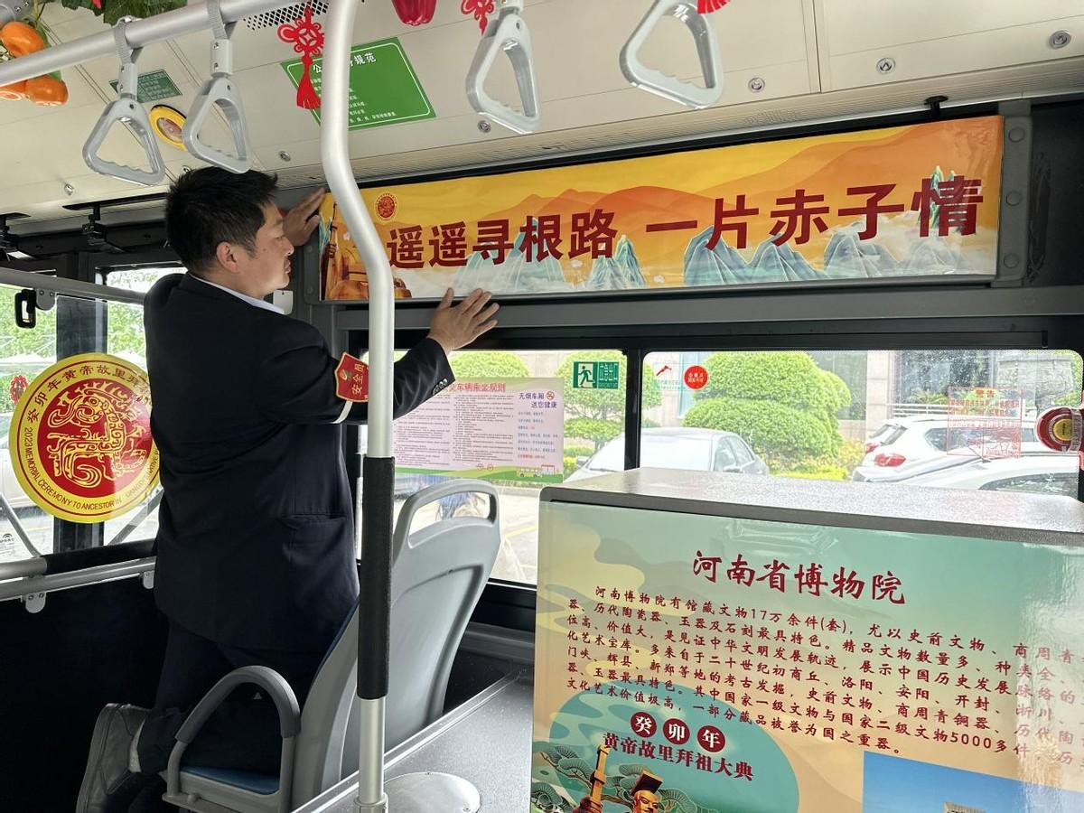 黄帝故里拜祖大典即将到来,为弘扬黄帝文化、黄河文化和中华优秀传统文化,坚持文化自信自强,郑州公交28路“文化车厢”以拜祖大典为主题,围绕河南特色和地域风情代表性美食、美景进行宣传,车厢外是拜祖大典口号标语,车厢内不仅将“黄帝故里拜祖大典”的演变过程做了详细介绍,还张贴了河南各类特色美食和风景宣传海报,烘托拜祖大典浓郁氛围的同时,让更多的乘客利用乘车的时间对“拜祖大典”的由来,以及河南的美食文化、名胜古迹、有了更深层次的了解。“拜祖大典大家都知道,但它的历史演变我还是第一次了解,今天又长知识了”,乘客阮女士一边拍照,一边对公交的流动宣传形式表示赞肯定。
