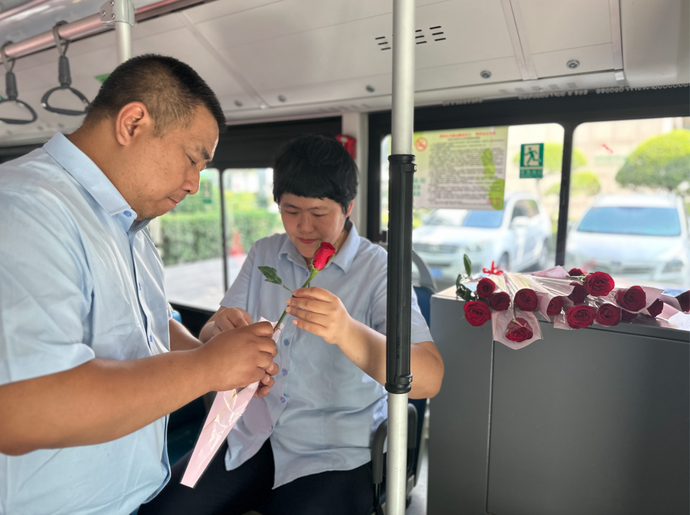 和他们一样的夫妻还有很多,徐飞和李寅姗也是其中一对。一大早,夫妻俩就开始小心翼翼地整理着提前准备好的玫瑰,“‘七夕’是中国的情人节,我们就提前准备了很多红玫瑰要送给乘客,希望能和大家共度这个浪漫的节日。”徐飞说,两人2005年一起来到公交公司,成为70路的车长,每天一起上班一起下班觉得很幸福。虽然工作很辛苦,但是很幸福。说话的功夫,两人已经把玫瑰花包装好,放在座椅上了,整个车厢充满了浪漫的氛围,没想到徐飞竟从驾驶座里拿出了一束花,深情地送到妻子手中。“老婆辛苦了,感谢能有你陪伴”,面对丈夫突如其来的告白,李寅姗红了脸,幸福地说着今天很开心。