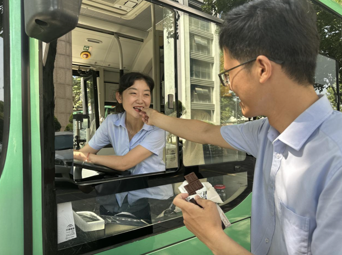 8月22日上午,在郑州公交省体育中心公交车场站里,刚刚交接完车辆的牛玉洁准备发车,丈夫杨争奎从包里掏出一块巧克力,赶紧打开掰下一小块儿,从驾驶室窗口喂到她嘴中,还不忘叮嘱她注意安全。他们都是郑州公交K97路的车长,2009年一起进入郑州公交集团,为了能更好地照顾家庭,两人开一台车上对班,也是“你上早班”,“我接晚班”的典型公交“夫妻档”,平时白天只能在交接班的时候匆匆见一面,相聚时间很有限。即便这样,丈夫也经常能给妻子准备一些小惊喜。今天是七夕节,他就早早买好了巧克力要送给妻子。“这么甜啊!”妻子接过丈夫手中的巧克力开心地说道。“妻子很辛苦,每天都比我干得多,不仅要工作,在家庭上也比我付出得多,心里总是对她有所亏欠,送上一束花,吃上一口巧克力希望她能感到甜蜜。”杨争奎知道妻子辛苦,常常会给妻子准备一些小惊喜,让她感受到快乐。