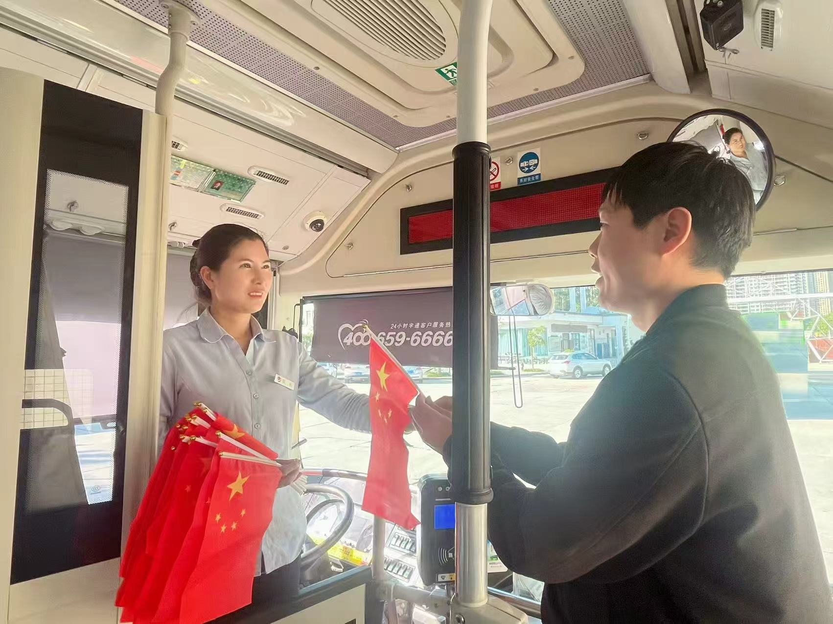 “你好,国庆节快乐,送你一面小红旗!”9月29日,郑州公交G126路车长田媛媛自费准备了100面鲜艳的小红旗,免费赠送给每一位上车的乘客,用一句句问候让整辆公交车充满了节日的喜庆氛围。