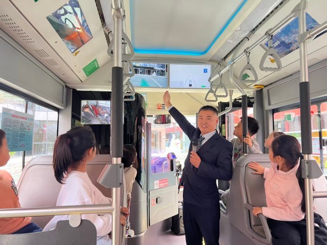活动现场,郑州公交B302路车长吴强为学生们讲解了L3级车辆的“智慧之处”,解释了车厢中高清显示屏显示的车辆速度行动轨迹、雷达感应实现信号优先等功能,同时对车厢中充电口、应急安全锤、逃生窗等安全设施的使用方法进行了科普。B5路青年文明号志愿服务队和地铁5号线晶馨志愿服务队全程参与,对学生们提出的问题逐一解答。