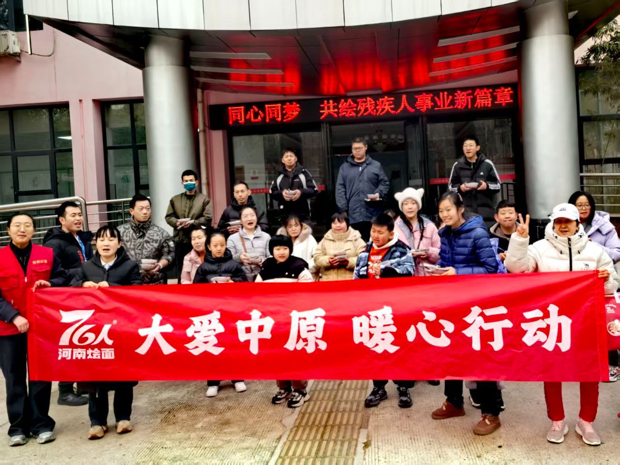 在郑州市残疾人康复就业服务中心,志愿者们将腊八粥送到残疾人学员手中。服务中心老师冯万朋表示,一碗碗腊八粥不仅暖心暖胃,也让孩子们感受到了一种踏实感。