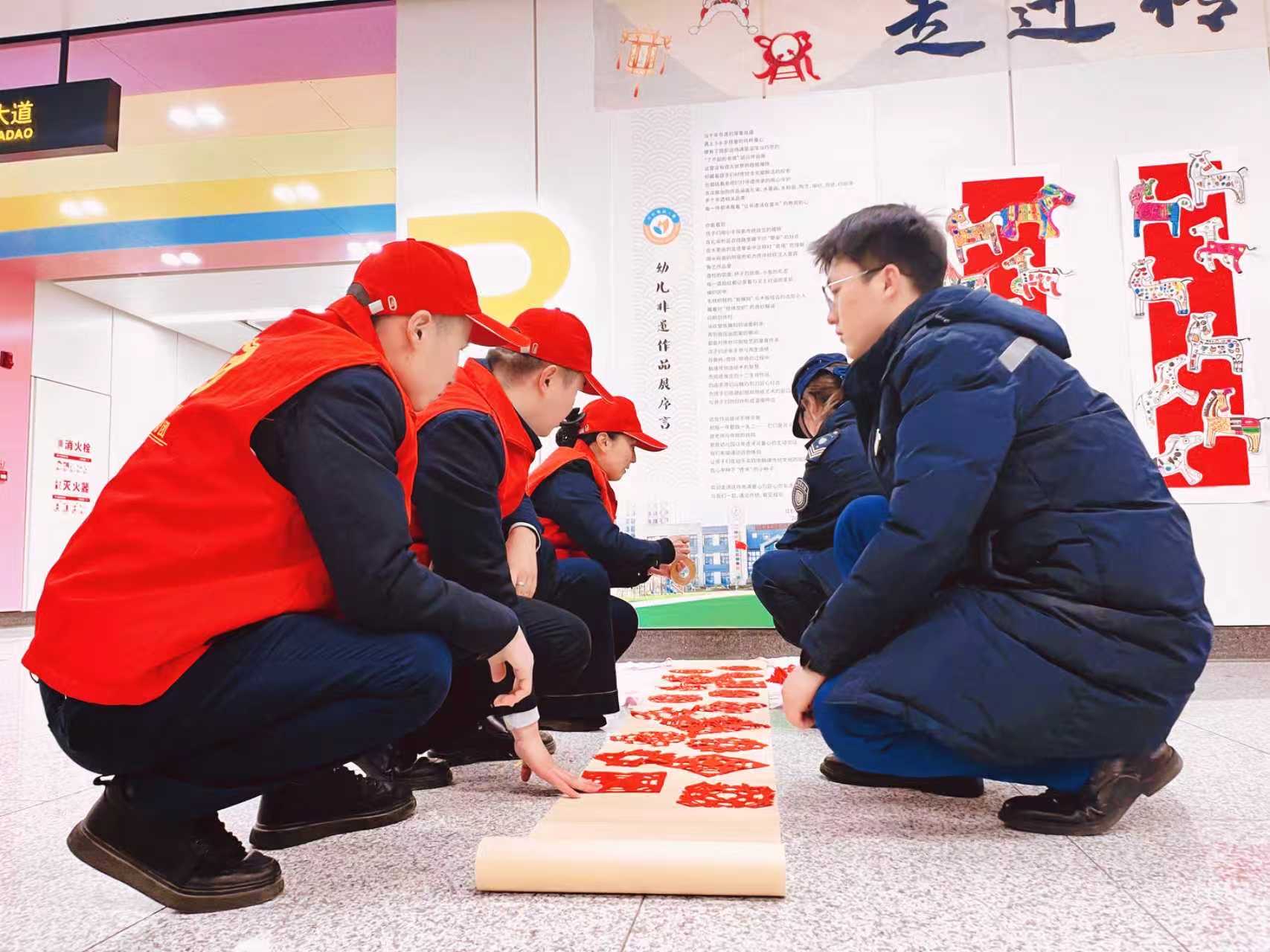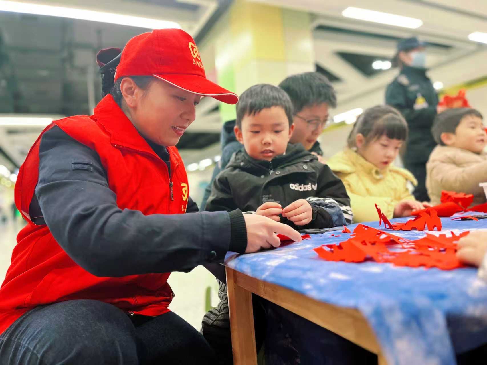 在创意剪纸区,孩子们围聚在桌旁,跟着志愿者的指导,小心翼翼地折叠红纸,细致地勾勒轮廓,精心地裁剪造型,个个都全神贯注。巧手翻飞间,一张张红纸蜕变成栩栩如生的小窗花,充满童趣的创作,为传统纹样注入了鲜活的新意。另一侧的书法台前,巴翠与地铁工作人员刘雅琪共同挥毫,一边示范握笔运腕的姿势,讲解春联的平仄对仗与“福”字的文化寓意,一边轻声传递绿色过年的理念,引导孩子们选择公交、地铁等绿色出行方式,让“流动的团圆”为城市添上一抹“绿色福气”。