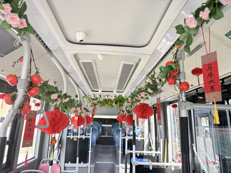 2月13日,马年新春将至,郑州公交B5路打造“柿柿如意”新春主题车厢。车厢内悬挂柿子挂件、红灯笼与新春装饰,年味浓郁,为乘客送上温馨祝福。