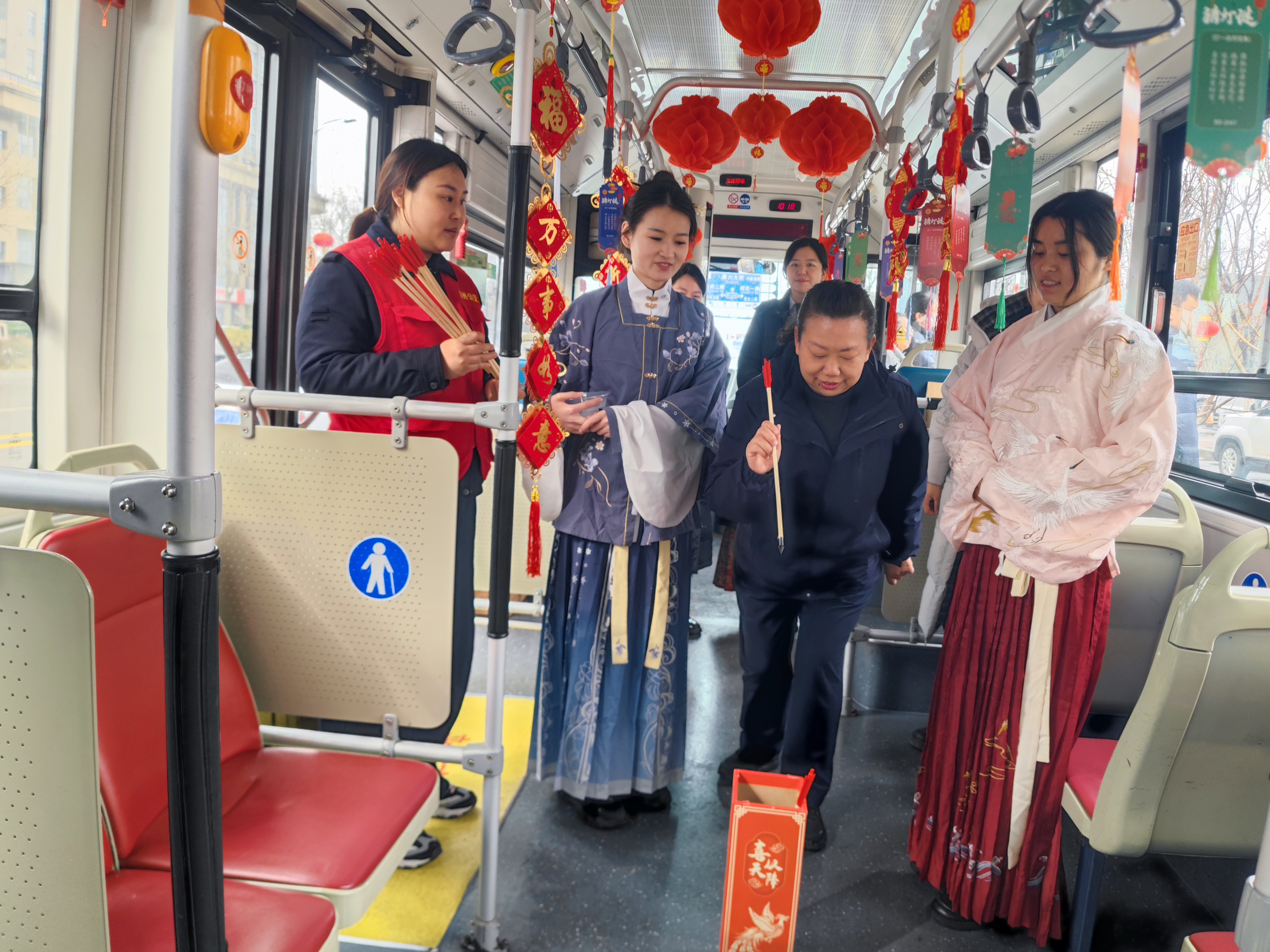 活动现场张灯结彩、年味浓郁,志愿者们身着明代古风服饰,化身诗词文化使者与市民互动。其中以明末清初才女柳如是为灵感打造的装扮典雅亮眼,尽显传统文人雅致风骨,让市民近距离感受中华历史文化的独特魅力。活动现场暖意融融,志愿者们为过往市民与乘客送上香甜软糯的元宵,同时精心设置猜灯谜、投壶等传统民俗体验环节。灯谜内容融合经典诗词典故、公交地铁出行知识、郑州本土特色文化,兼具趣味性与知识性;投壶游戏带领市民沉浸式感受古人休闲雅趣,现场市民踊跃参与,欢声笑语此起彼伏,处处洋溢着喜庆祥和的节日氛围。