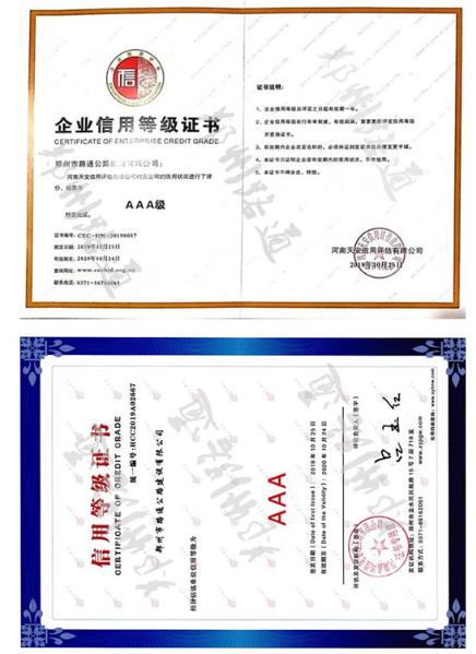 同时河南鑫诚信用管理咨询有限公司评审的省级企业信用等级,路通公司也通过了AAA等级。