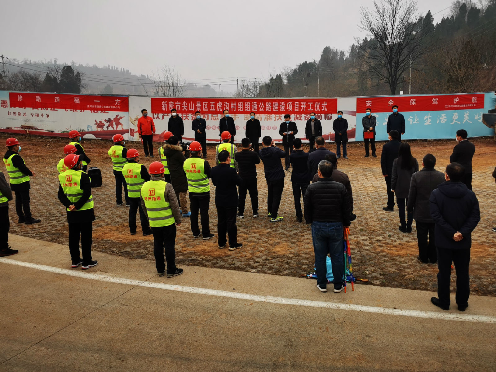 3月9日,由郑州市路通公路建设有限公司承建的新密市尖山景区五虎沟村组组通公路建设项目举行开工仪式,郑州市发改委主任杨东方、市公路事业发展中心主任田俊良、新密市副市长张宏杰、新密市公路局局长张进中等领导出席,路通公司董事长胡香凯、工程分公司负责人作为建设单位主要负责人陪同出席。